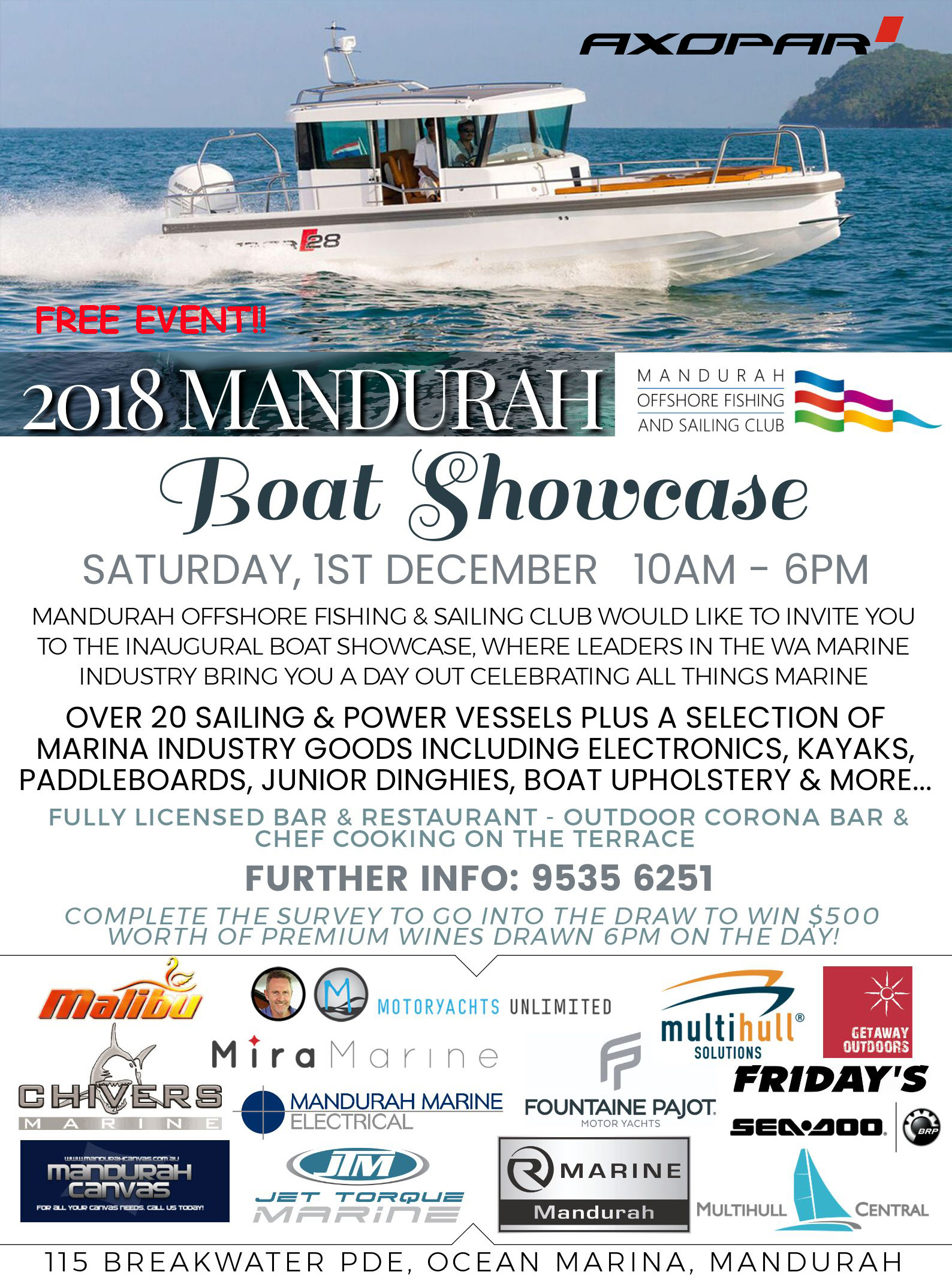 Come down to Mandurah on December 1 and see a showcase of magnificent luxury boats on display for this free event. Eyachts and Motoryachts Unlimited will be presenting the award winning Axopar 28 cruiser, the first of these remarkable craft to hit WA waters.